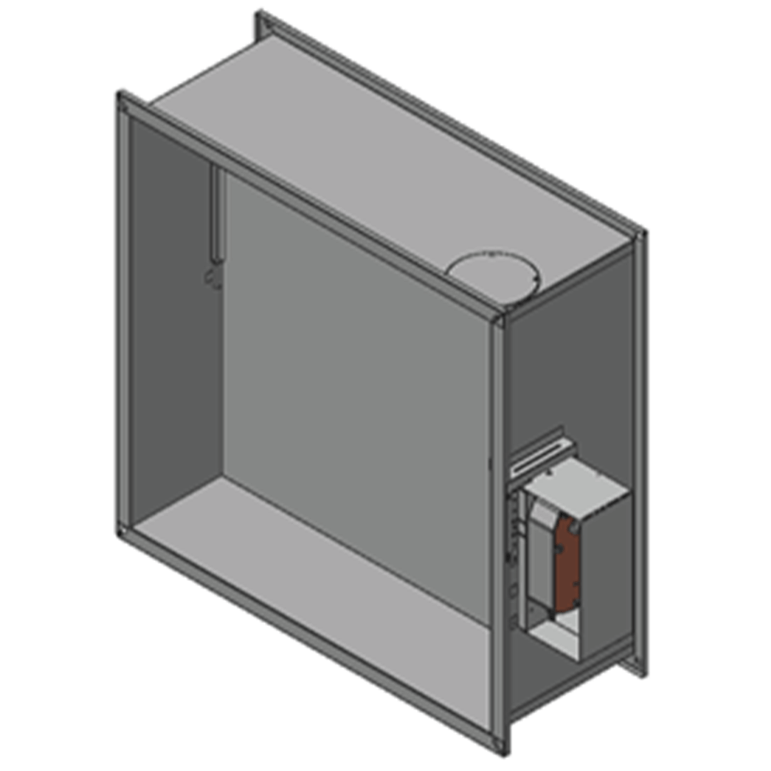 Клапан канального исполнения представляет собой конструкцию с прямоугольным корпусом, заслонкой и приводом, расположенным снаружи корпуса. Корпус выполнен из оцинкованной стали и по своей форме аналогичен отрезку воздуховода длиной 320 мм, с фланцами, интегрированными в корпус, что позволяет подсоединить воздуховод с одной или обеих сторон.
