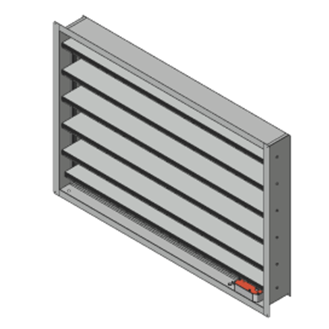 Клапан предназначен для установки в проем (стеновое исполнение, без торцевого подсоединения к воздуховоду). Многостворчатый клапан состоит из корпуса прямоугольной формы глубиной 220 мм, оснащенного фланцем с одной стороны.